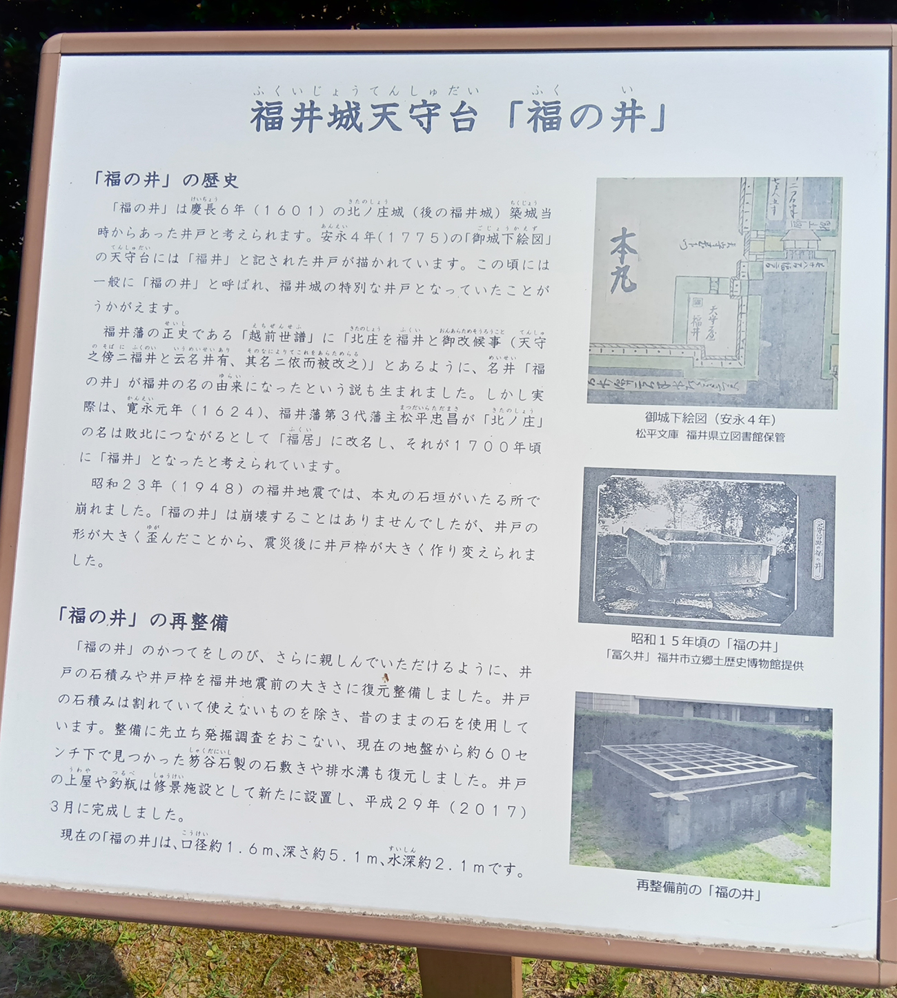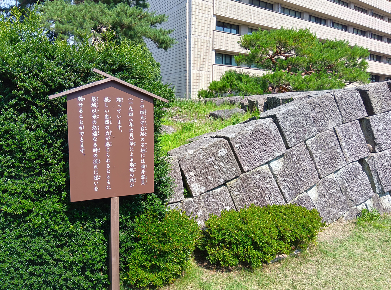 中に入ってみると、城跡だけあって史跡もあった。個人的には天守台跡の石垣が一番歴史の重みを感じる。1948年の福井震災でナナメになった石垣なども残されていて、色々乗り越えての今であることを実感できた。