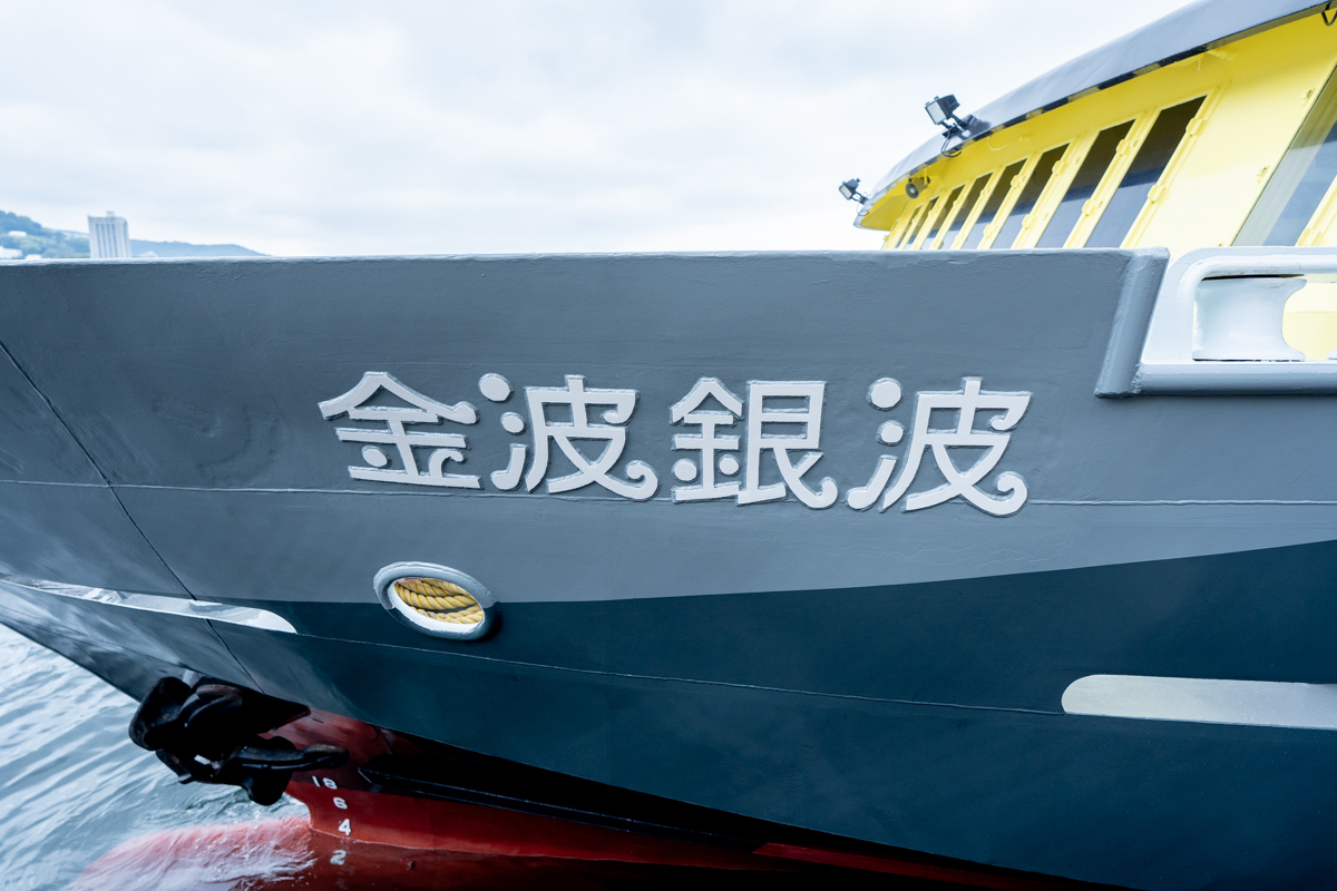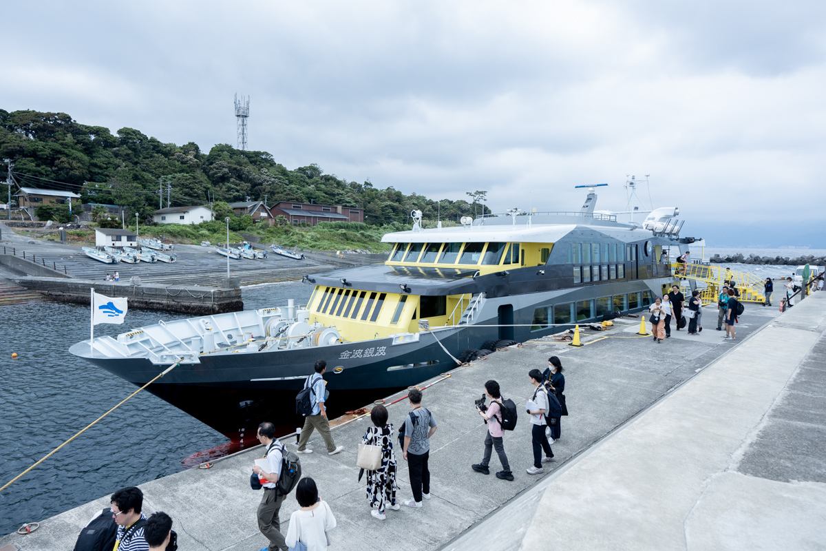 そして港には、すでに待機していた「金波銀波」。初島の岩石をイメージしたグレーと、熱海が国内のレモン発祥の地ということで、レモン由来の黄色の船体。