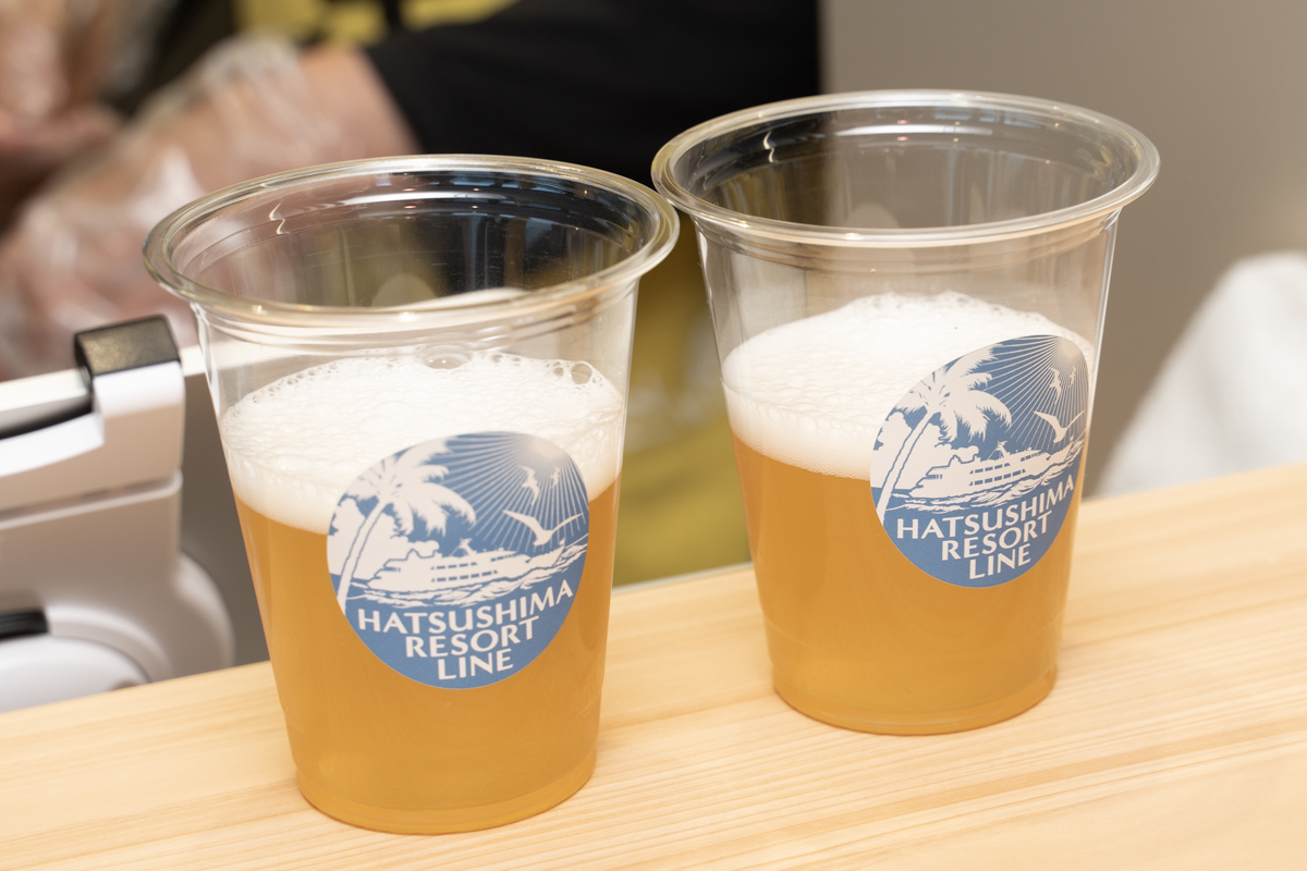▼これが船内でも売られる伊豆レモンビール。製造する宇佐美麦酒の加藤代表も乗船していた。