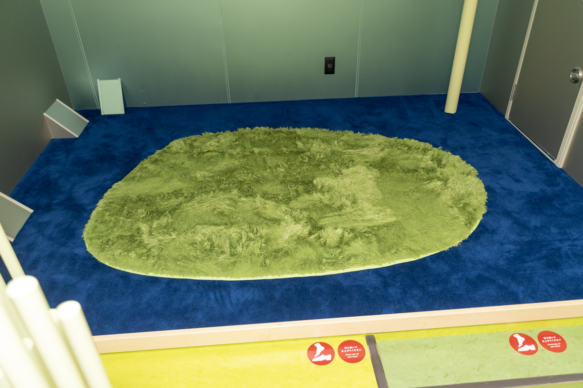 人工芝が敷かれており、中央にユニバーサルデザインの円形のベンチが設置されている。なんか面白い形状だ。触ると弾力がある。