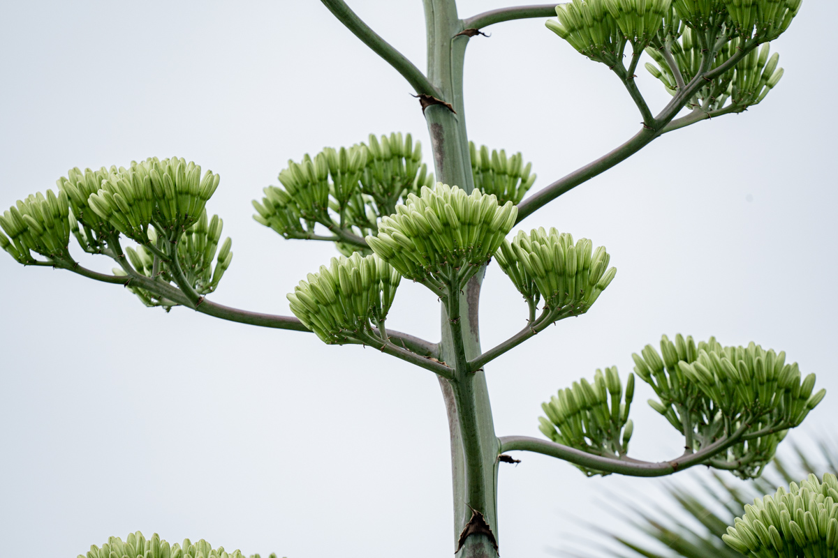 ▼ちょうど、敷地内のリュウゼツランが咲きそうとのことだった。葉に模様が無い。これはアオノリュウゼツランだろうか。