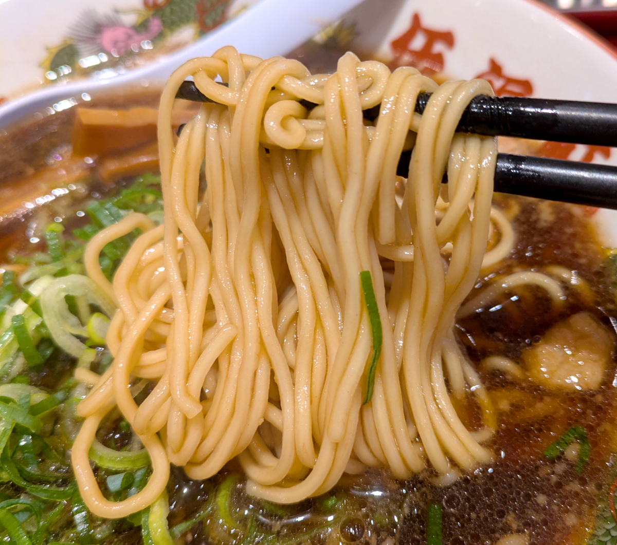麺は細麺で、やはり京都ラーメンの影響を感じさせるものがある。異なる点は豚の旨味と背脂だろう。見た目に反してあっさりした味が特徴の京都ラーメンに対して、こちらは見た目通りに味が濃い。だが、富山ブラックのようなコショウ辛さはなく、醤油の辛さが味を印象付けている。