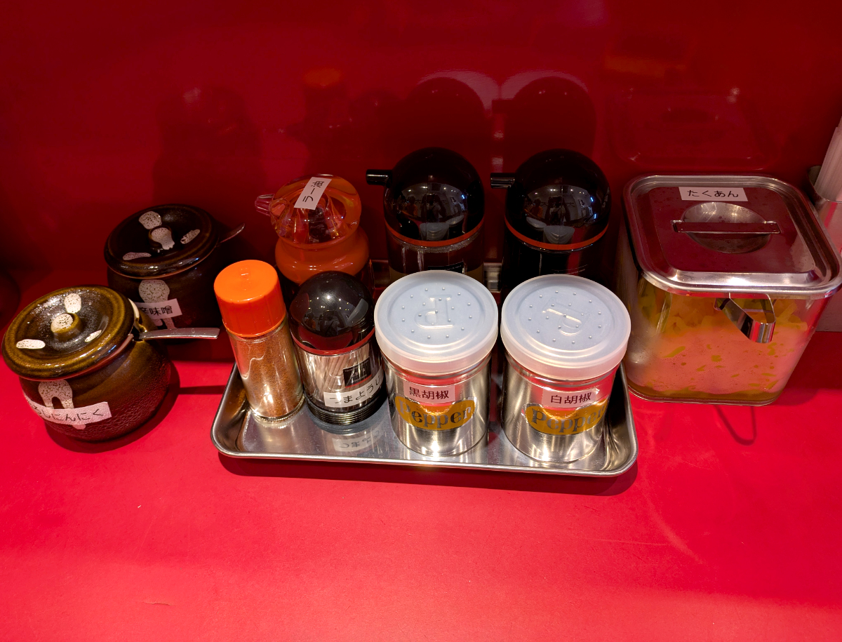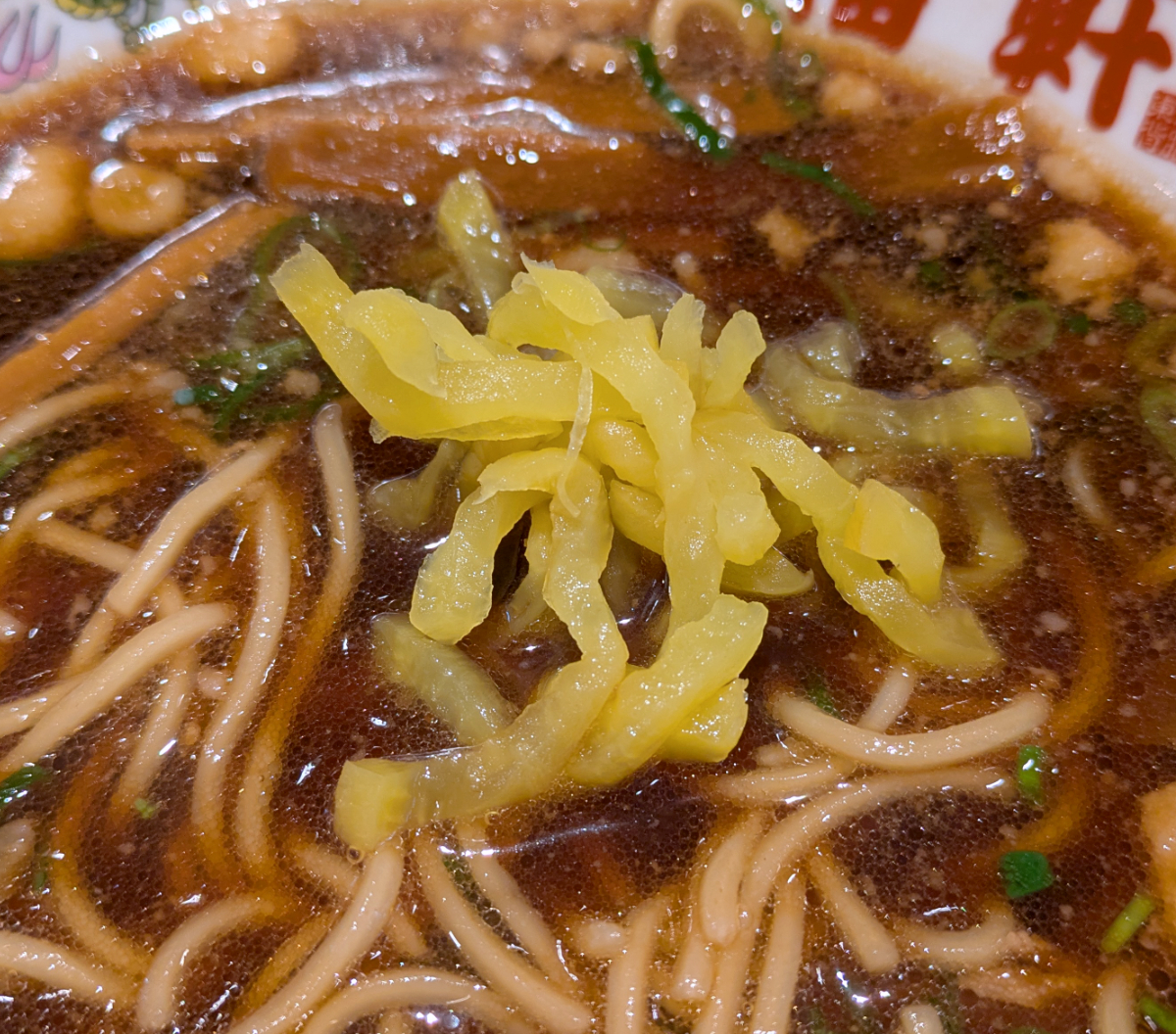先ほど卓上にあったたくあんはどう使うべきか? 悩みどころではあったが、ためしにラーメンに入れてみると、これが意外と良く合った。たくあんの酸味と食感が、濃い味の中で絶妙なアクセントになるので、適度に使うことをおすすめしたい。