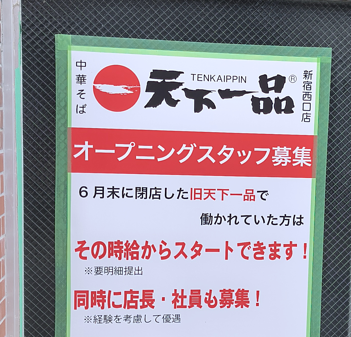 「オープニングスタッフ募集 6月末に閉店した旧天下一品で働かれていた方は、その時給からスタートできます!」