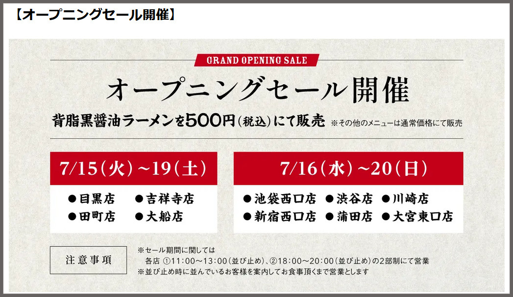 15・16日の間にオープンするのは、目黒・吉祥寺・田町・大船・池袋西口・渋谷・川崎・新宿西口・蒲田・大宮東口の10軒だ。