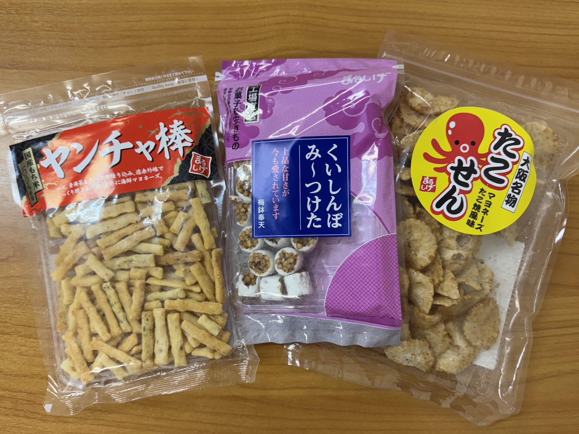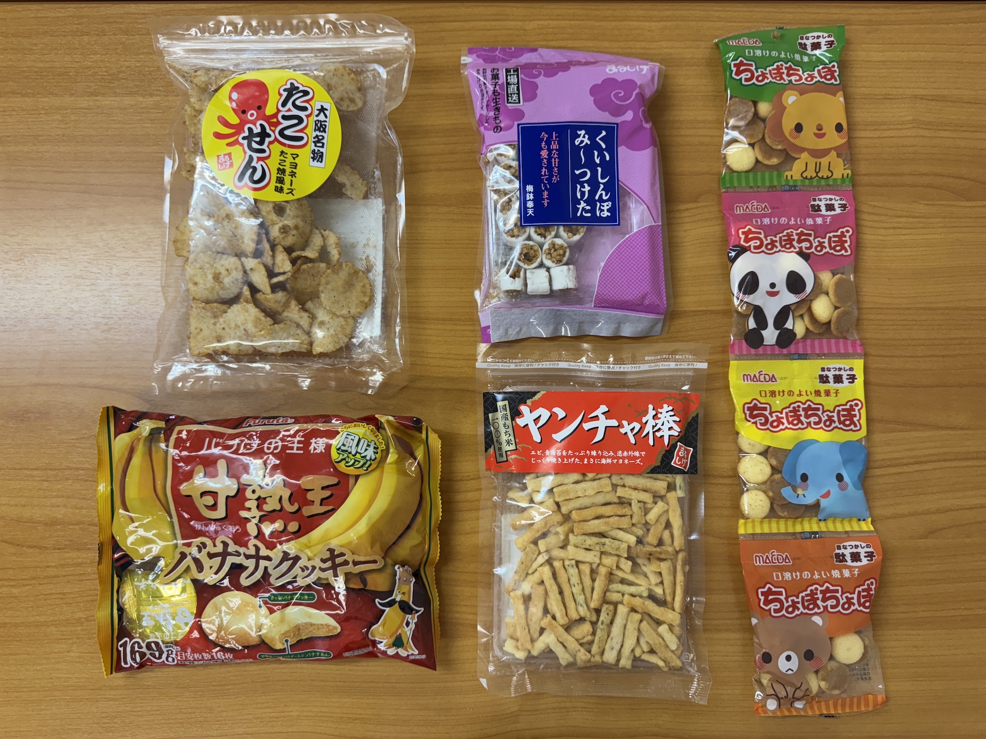 『大阪名物 たこせん』(238円)、『くいしんぼみ〜つけた』(258円)、『ちょぼちょぼ』(112円)、『完熟王 バナナクッキー』(278円)、『ヤンチャ棒』(298円)。