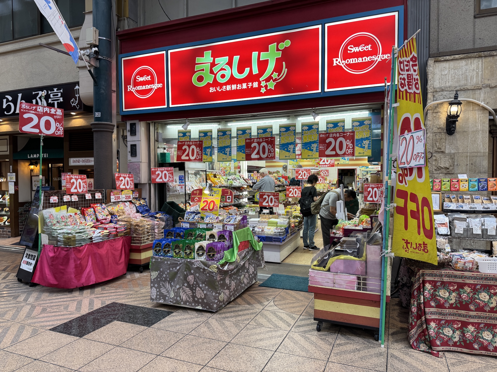 先日、日本一長い商店街として知られる大阪の『天神橋筋商店街』を端から端まで歩いてみた。するとスタートしてすぐ『お菓子のまるしげ』なるお店を発見。関東在住民なら即座に「『お菓子のまちおか』みたいだな〜」という感想を抱くネーミングと雰囲気だ。