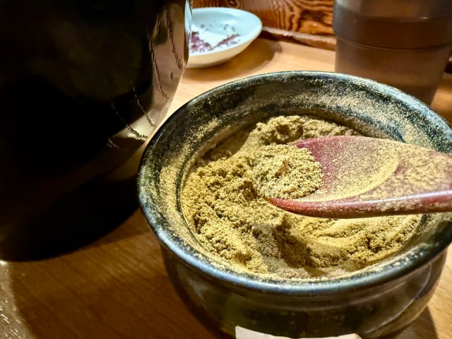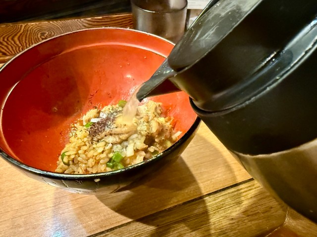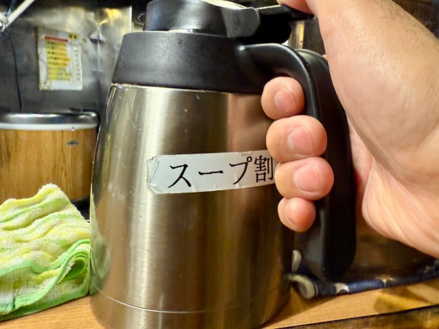 「スープ割り」のポットを取って、丼へ出汁を注ぎ込みます。