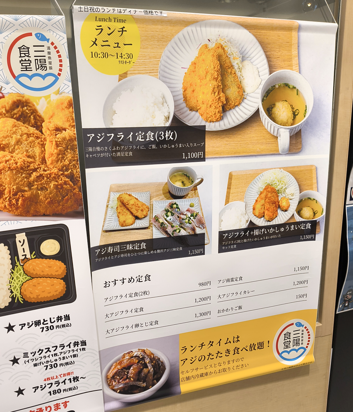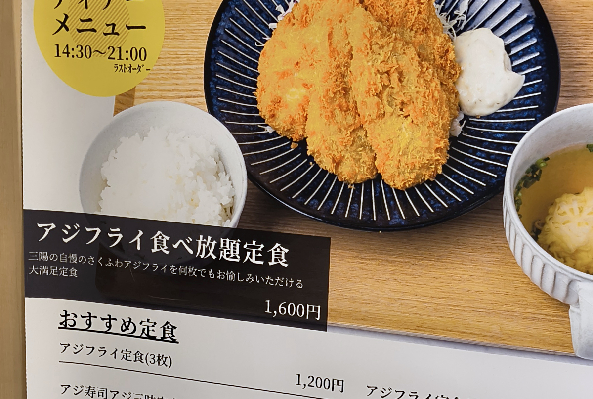 ところが! ランチメニューに食べ放題はない。ランチは数量限定でアジのたたきが食べ放題ではあるものの、フライは食べ放題になっていないのである。