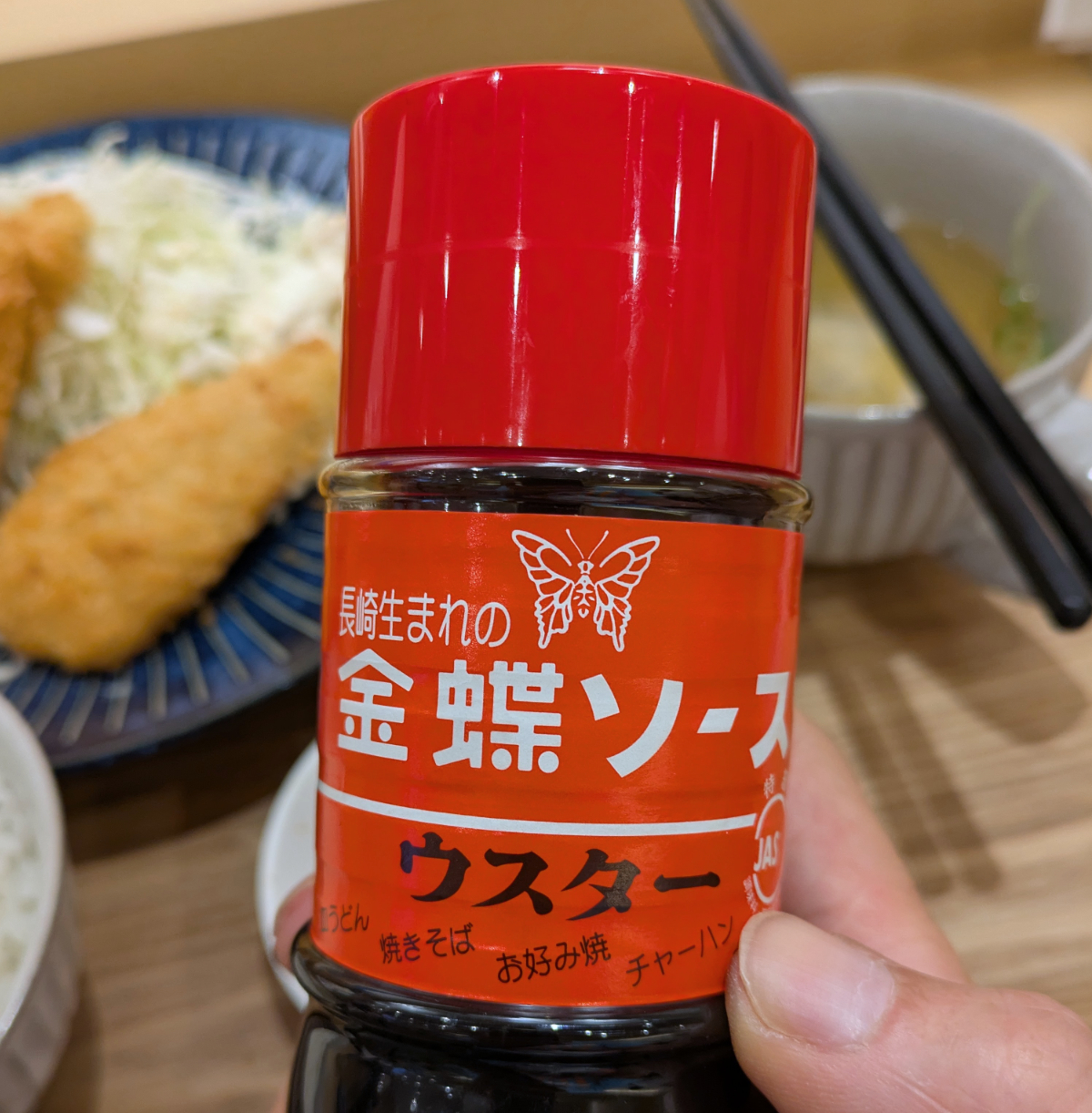 やっぱサクサク衣にはもったり食感のタルタルソースが1番合うよね。とはいえ、卓上に2種のソースが用意されている。そのうちのひとつ、ウスターソースでも食べるとしよう。この「金蝶ソース」は長崎生まれのブランドソースで、皿うどんの名脇役として親しまれているそうだ。
