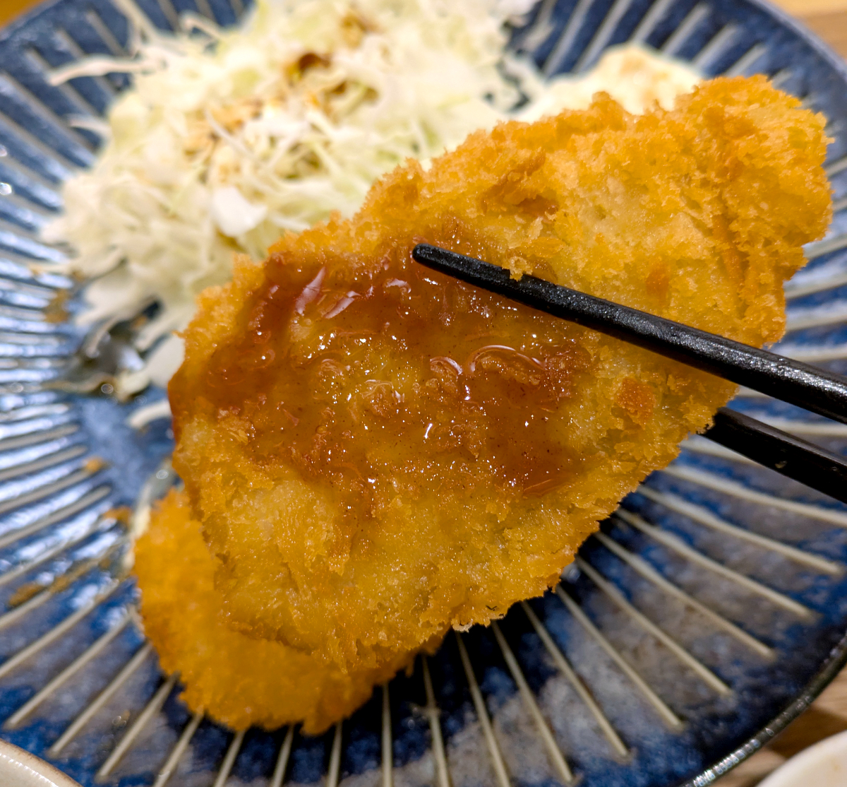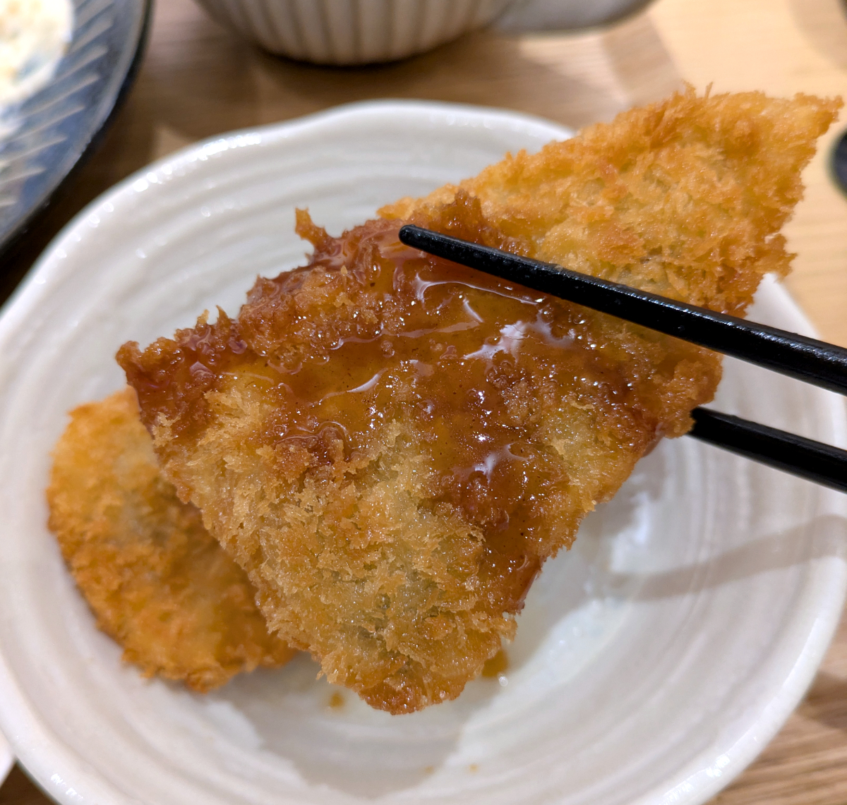 今一度、中濃ソースをたっぷりかけて頂きます。ホカホカの揚げ立てだけあって、歯ざわりがイイ! 高感度の収音マイクで噛む時の音を録りたいくらいだよ。