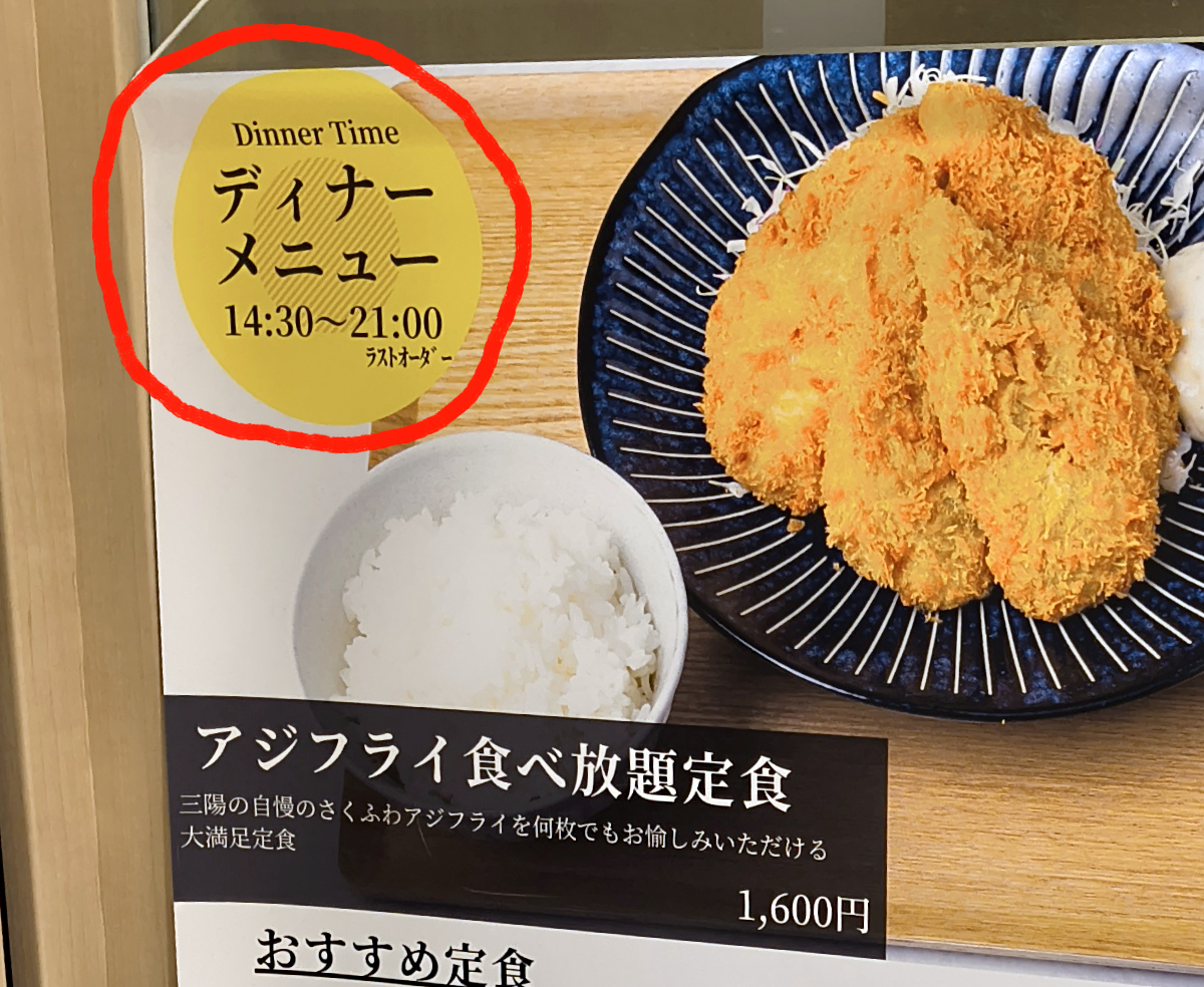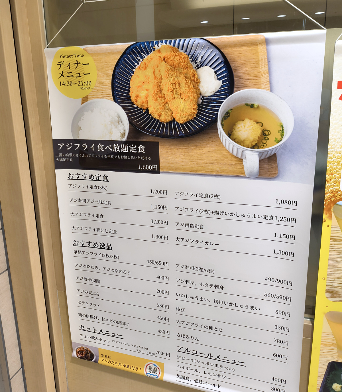 では、アジフライの食べ放題を実施していないかというと、そうではない。ディナーメニューを見てみると……。
