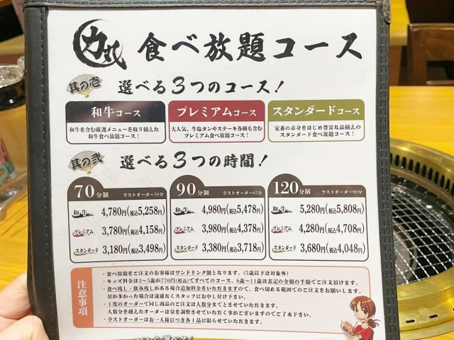 最安はスタンダードコース70分で税込3498円だ。カルビ・ハラミ・ロースが含まれるので内容的には十分だが、今回はタンやステーキも食べ放題のプレミアムコース120分を注文(税込4708円)。