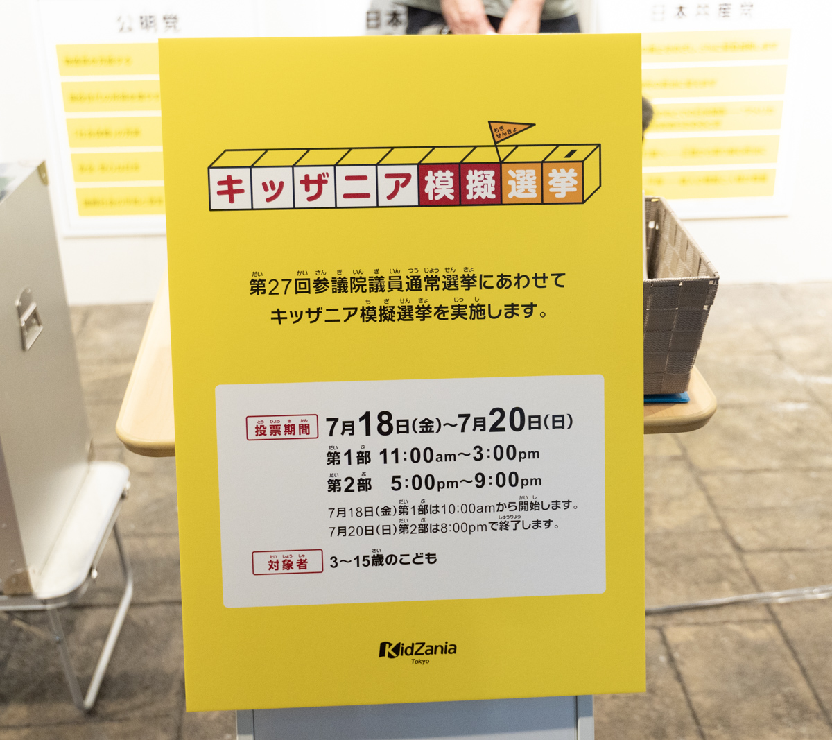 今回は7月18日から20日までの期間で、3~15歳のキッズが対象。入場時に「模擬選挙のお知らせ」という紙を貰えるので、それを持ってキッザニア内の投票所に行けば、投票できる。