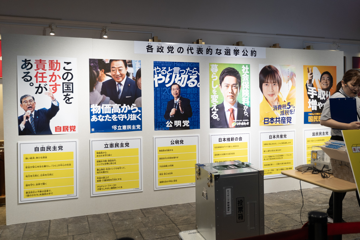 投票所に行くと、ガチな政党のポスターと、各党の公約が書かれたボードが壁に貼ってあるのだ……! 世界観が急に生々しくなったな。