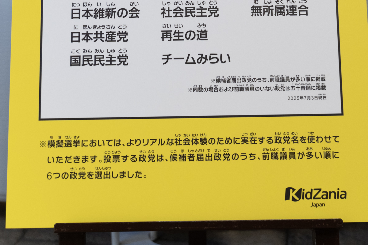 ちょ、待てよ。6政党しか貼られていないぞ? これはキッザニアの政治思想か……? そうではないのでご安心を。