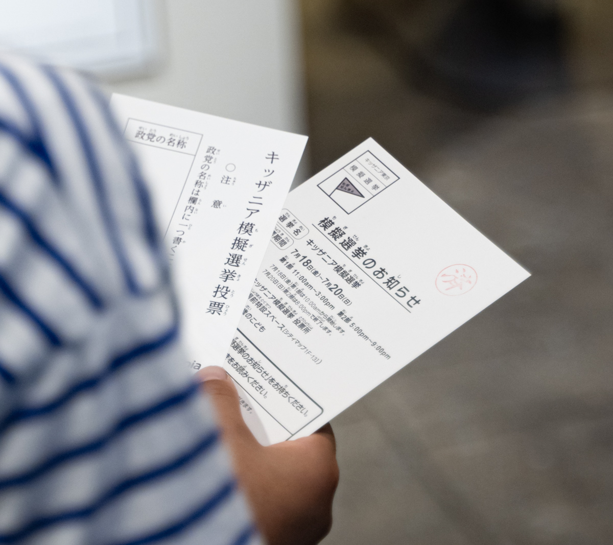おっと、そうこうしていたら、キッズが投票しにやってきた。実際の行程を見てみよう。まずは「模擬選挙のお知らせ」をスタッフに提示。