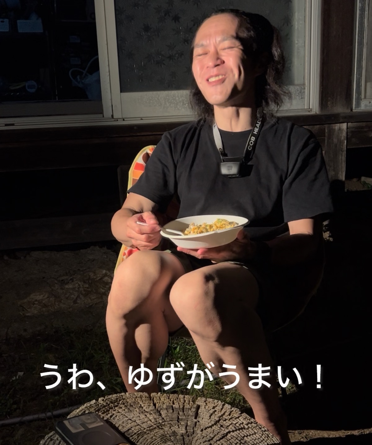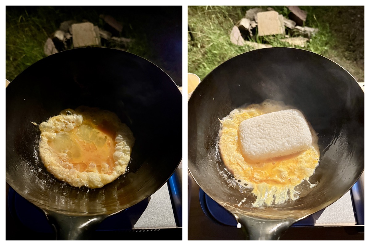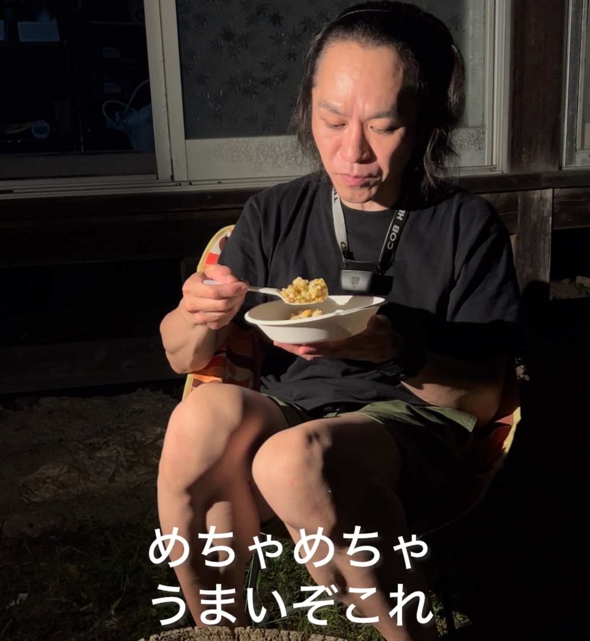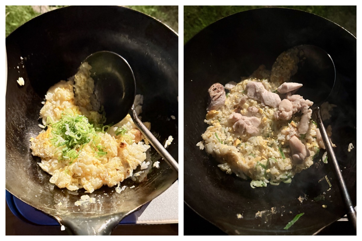 時刻は夜。真っ暗な山奥の中、ひとり中華鍋を振る “暗闇ナイトチャーハン” な状態だったが、仕上がりは上出来。