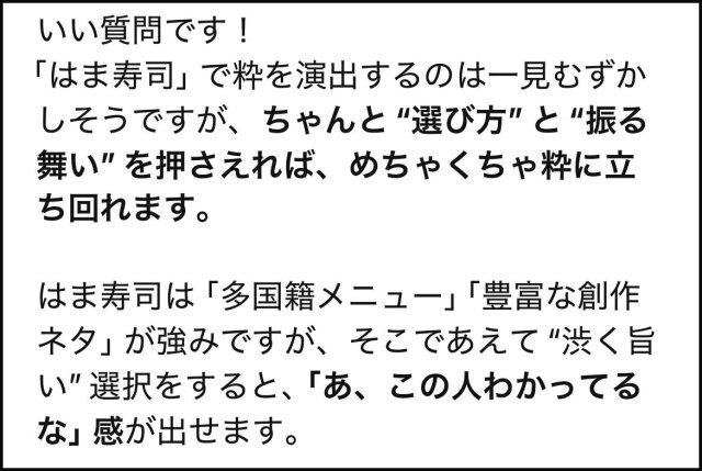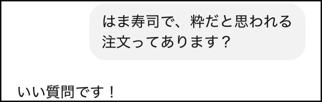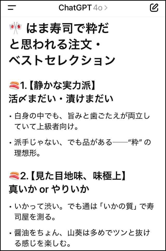そんなChatGPT4oに、「はま寿司で粋だと思われる注文ってあります?」と聞いてみたところ、「いい質問です!」というレスポンス。