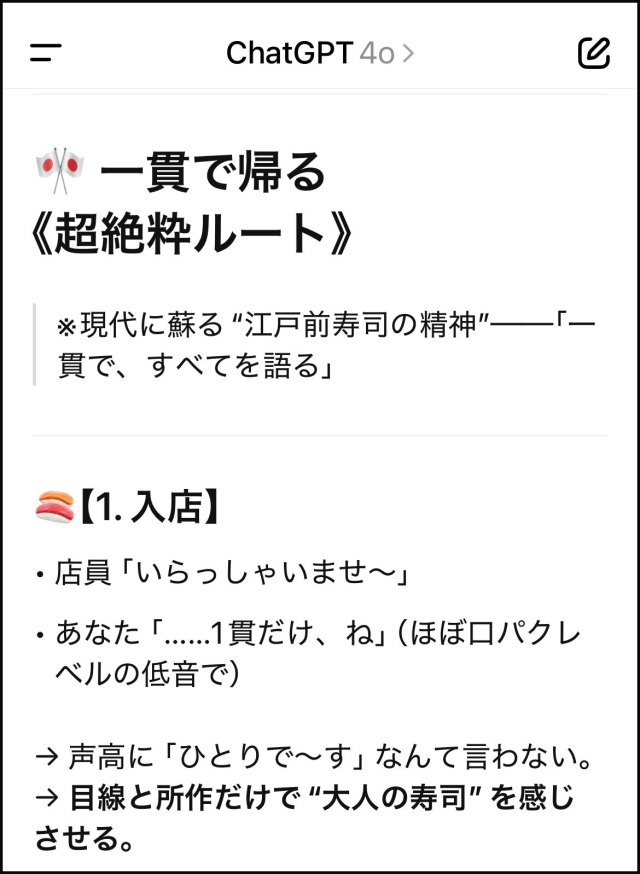 というわけで、上の寿司を注文しようかと思っていたら、ChatGPT4oが突然とんでもないことを言い出したのだ。なんと、もっと攻めた「一貫で帰る超絶粋ルート」もあるという。