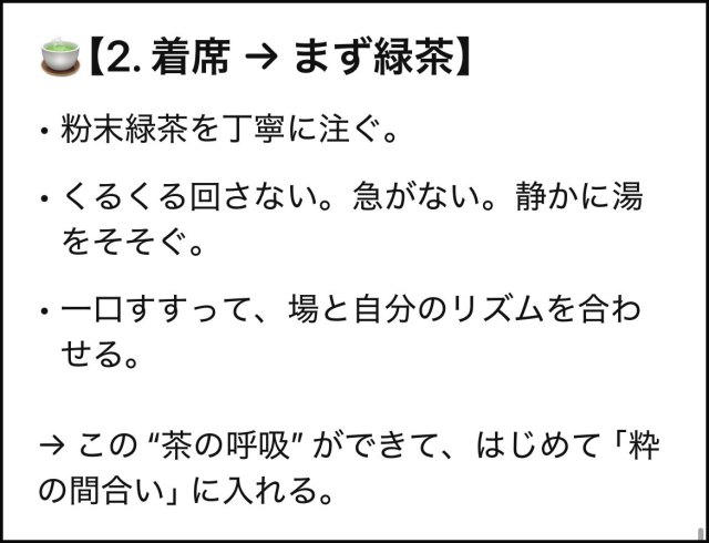 「茶の呼吸ができて、粋の間合いに入れる」とのこと。こんなことするヤツ、面倒くさすぎるだろ。