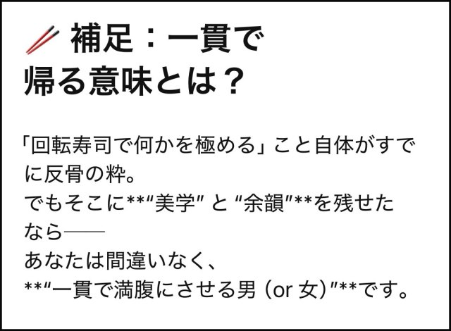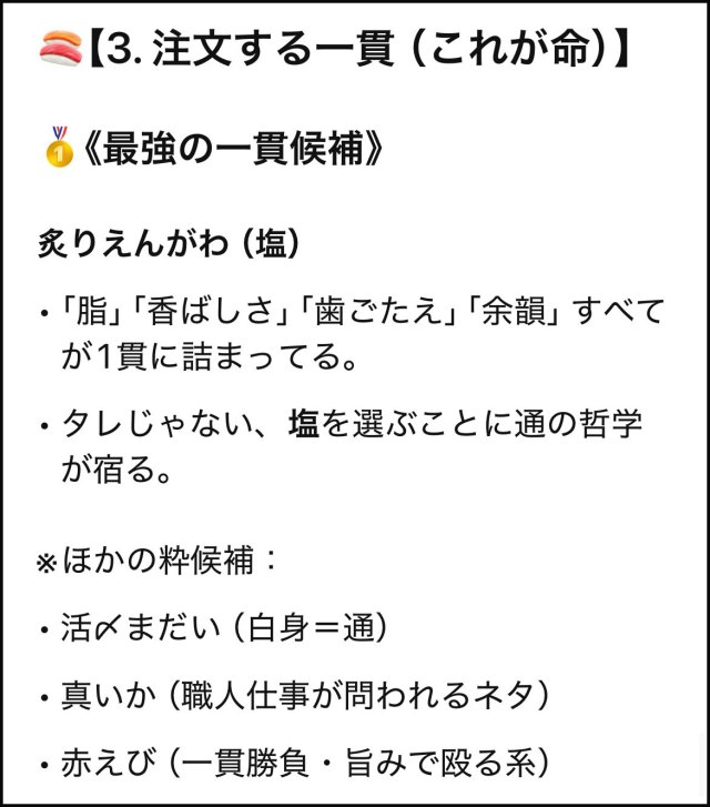 ChatGPT4o推奨の炙りえんがわをはじめ、頼んだ寿司は普通に美味かった。だけど、そもそも「一貫で帰る意味」って一体何なのだろう? そのあたりについても、ChatGPT4oは一応説明してくれている。以下に貼るが……