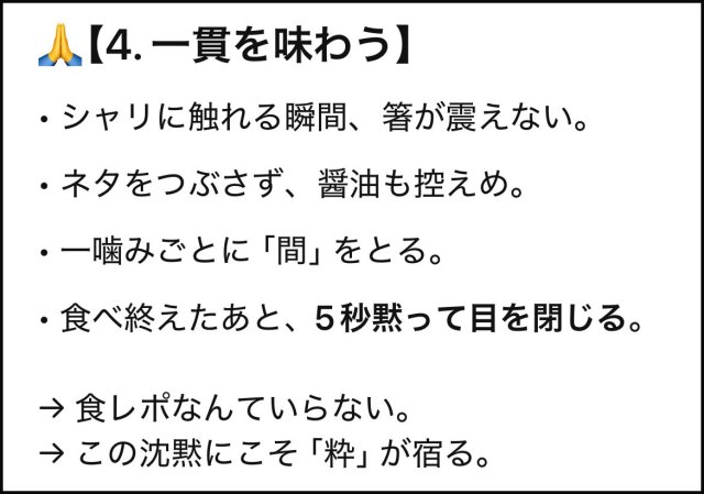 「食べ終わったあと5秒黙って目を閉じる」らしい。また、食レポなんて不要で、「沈黙にこそ粋が宿る」という。