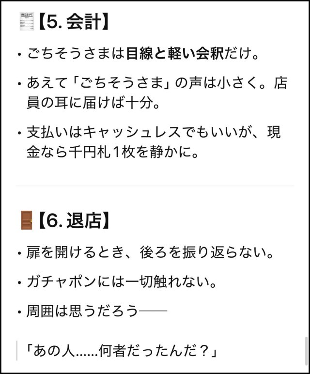 回転率が命のチェーン店でそんなことをしたら、店員さんからすると「普通に会計してくれ」って感じになるのでは? そう思われてしまったら、“粋” とはほど遠い振る舞いでしかない。