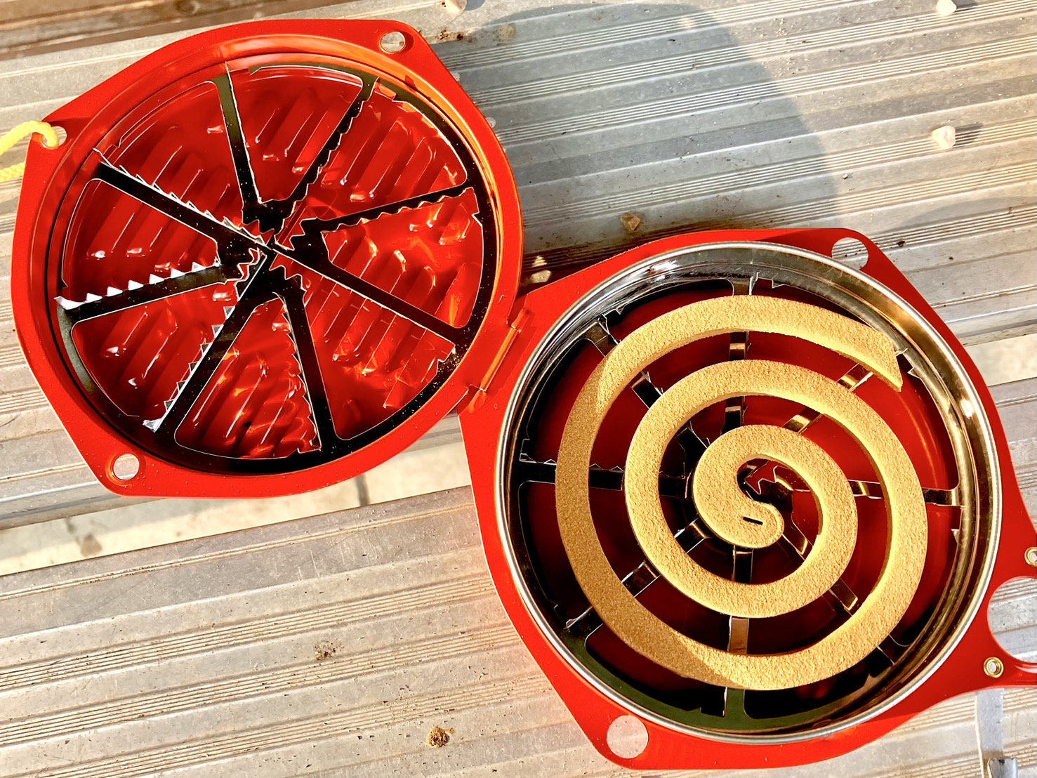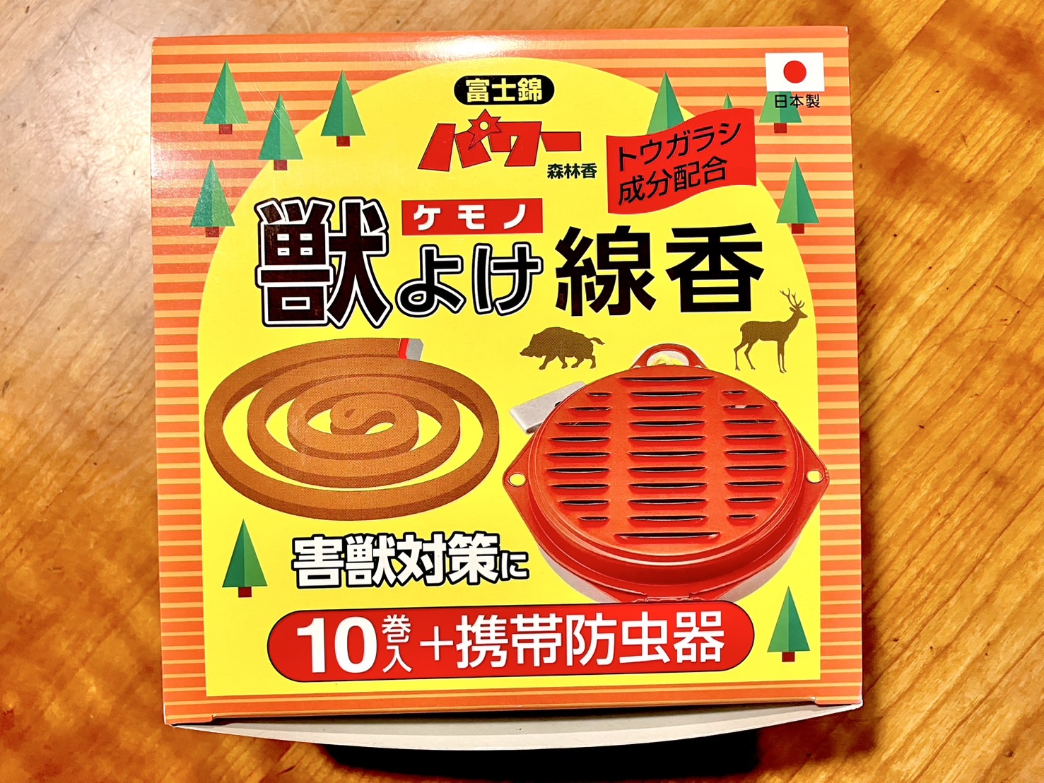 分厚い蚊取り線香のような形をした獣よけ線香が合計10巻、金属でできたケース、写真を撮り忘れてしまったけれどおまけの蚊取り線香が2つ入っていた。