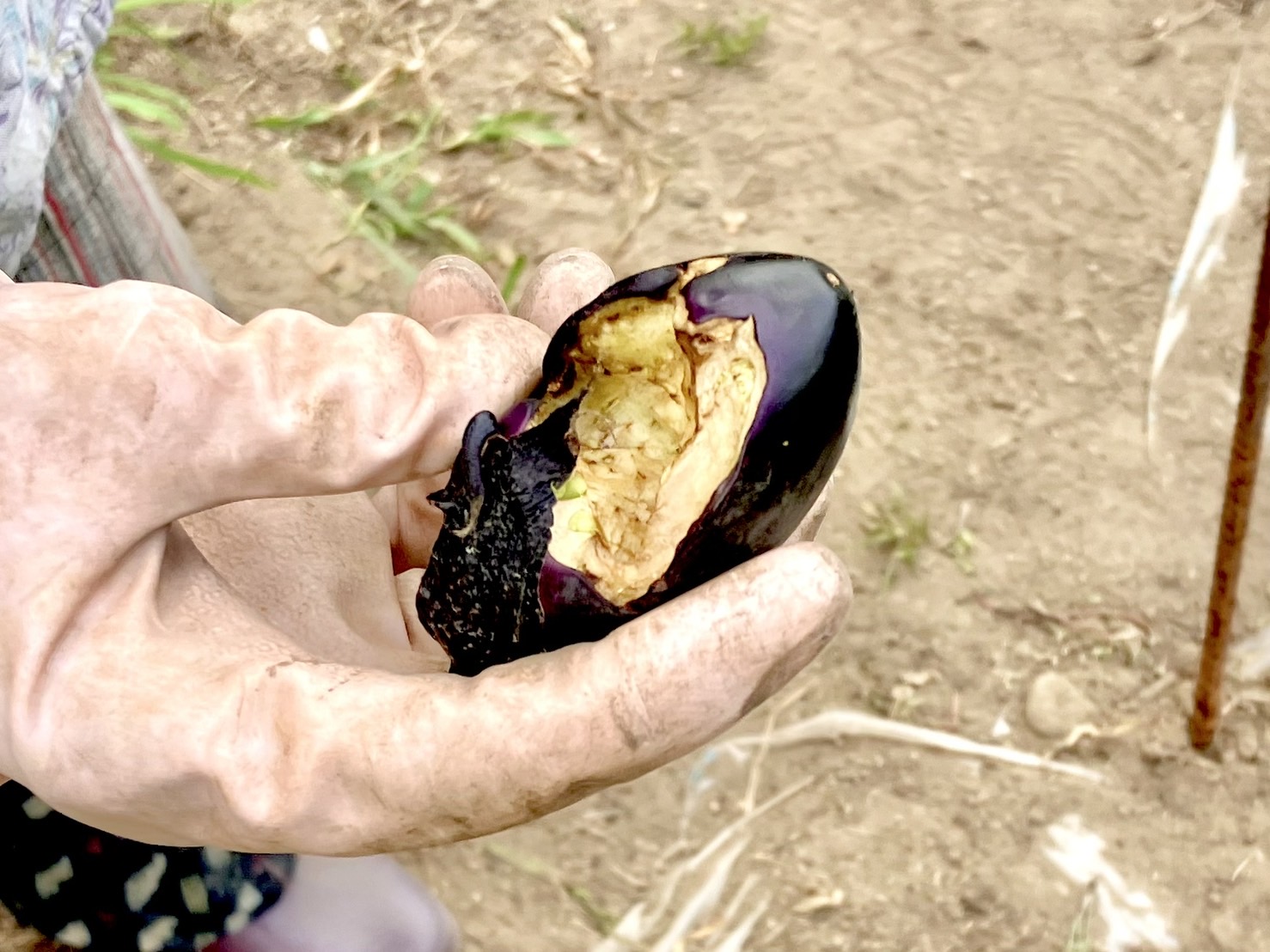 うわ、マジで荒らされてる……! そこにはかじられたナスやトマトが転がっていた。