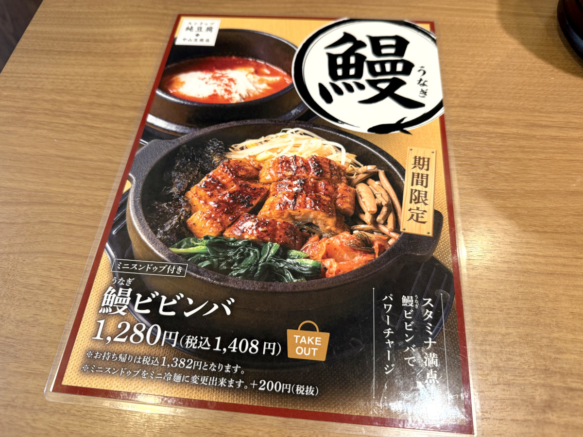 結果的に『うなぎビビンバ』はうなぎの存在感があるメニューだったので、立派な「土用の丑の日メニュー」と言えるハズ。年がら年中あるメニューではないため、気になる人はぜひこの機会にご賞味いただきたい。