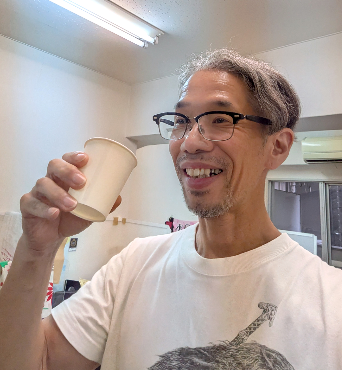 コップに注いで飲むとしよう。この日、編集部にいた羽鳥と原田と乾杯だ。