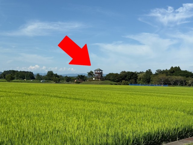 さっそく向かったのが「アテルイの里」。駅からそう遠くはないが、周囲は田園地帯なので車が必要。新緑の田んぼが広がる美しい景色の中、木造のやぐらのようなものが見えてくる。