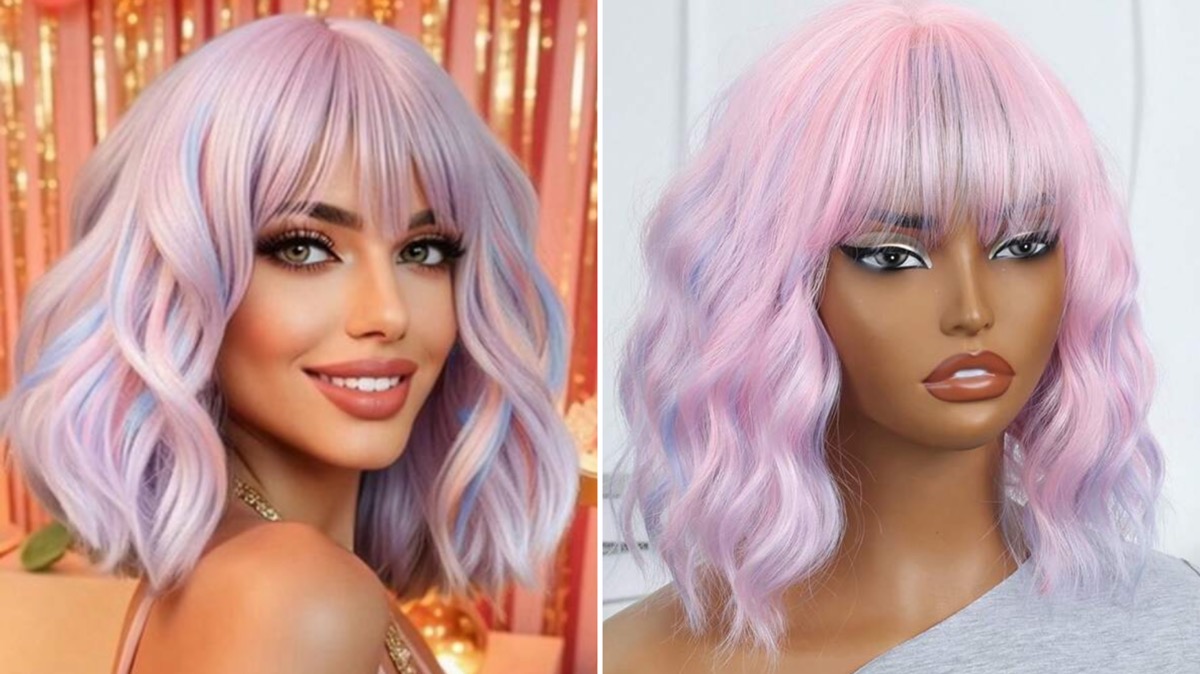 商品名「高品質 ピンクとパープルのピアノカラーの熱に強い合成繊維カールボブウィッグ前髪付き、レディース、ホリデーパーティー、デイリーウェアにぴったりHOT」(1235円)