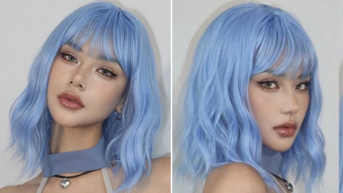 商品名「女性用 ショートボブ ウィッグ バングス ロングボブ シュルダーレングス ウェーブ ウィッグ ロック シンセティックコスプレウィッグ カラフルコスチュームウィッグ(ライトブルー) ウィッグ かつら カツラ つけ毛 うぃっぐ」(1080円)