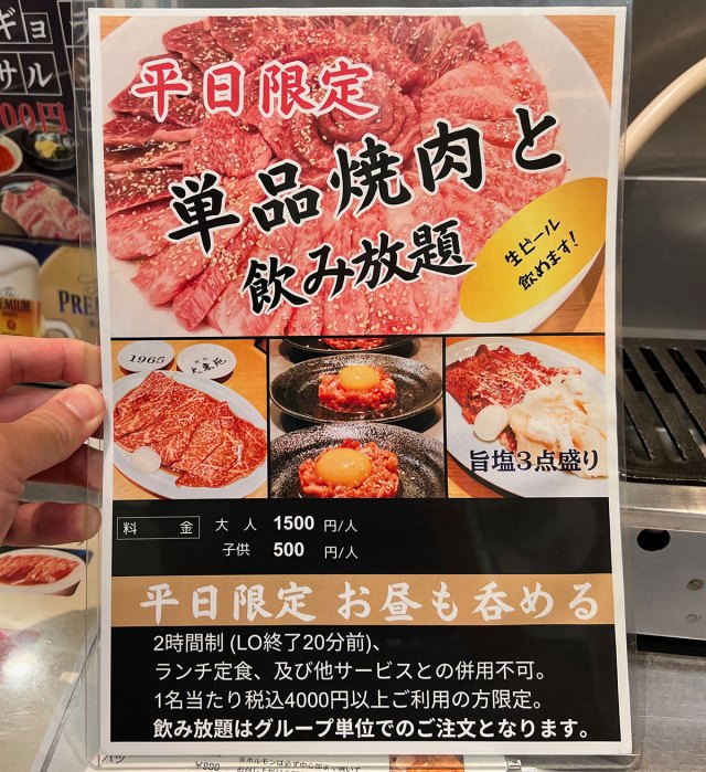 平日限定の2時間飲み放題が1500円。「ビール1〜2杯程度ならまだしも、昼から飲み放題はダメだろ」と思う一方で、平日限定の文字を見て「まさに今じゃん」という気持ちにもなった。