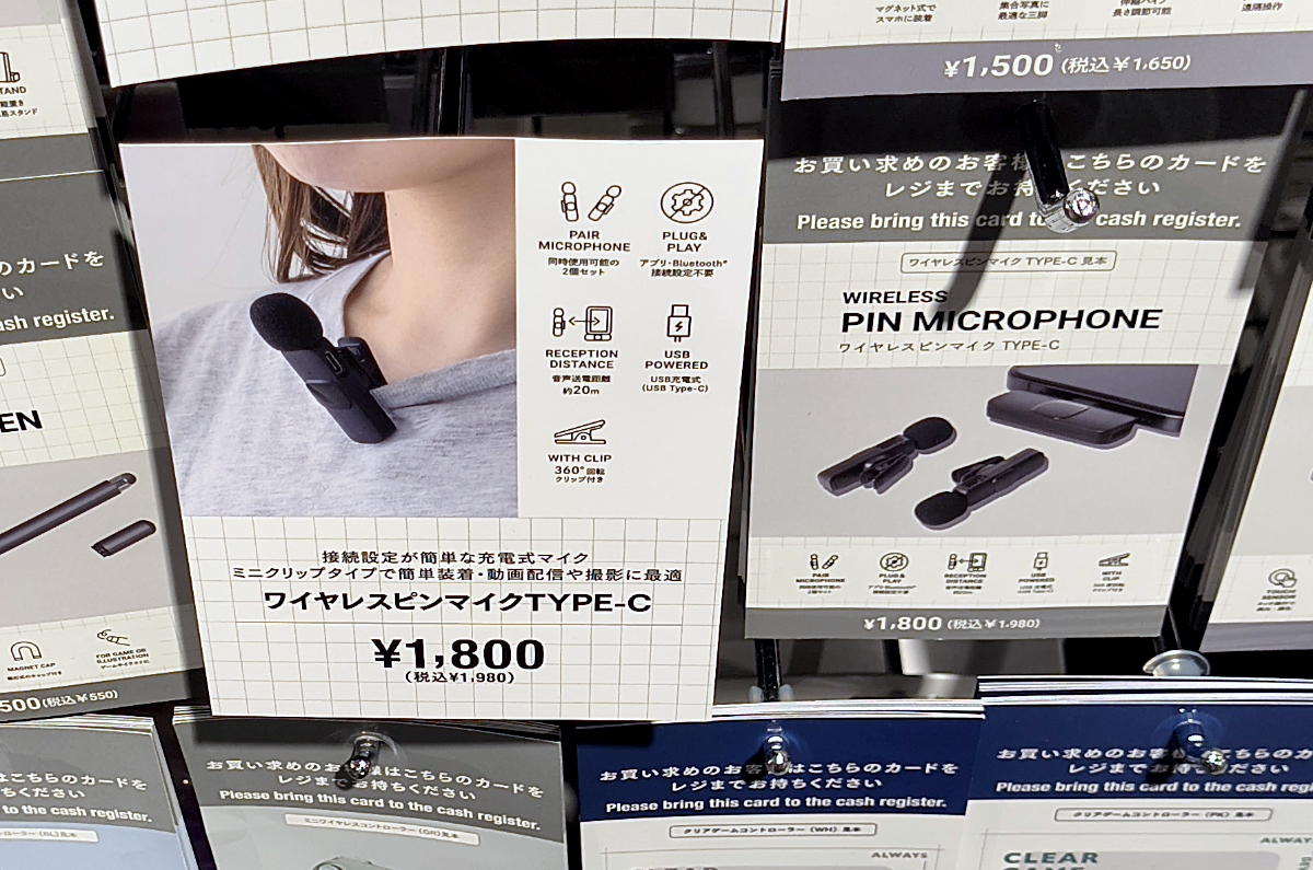 個人が動画を撮影するのは、もう珍しいことではない。したがって雑貨店でマイクが販売していても、それほど驚くことではないのだが、まさかピンマイクを販売するようになるとは思いもよらなかった。