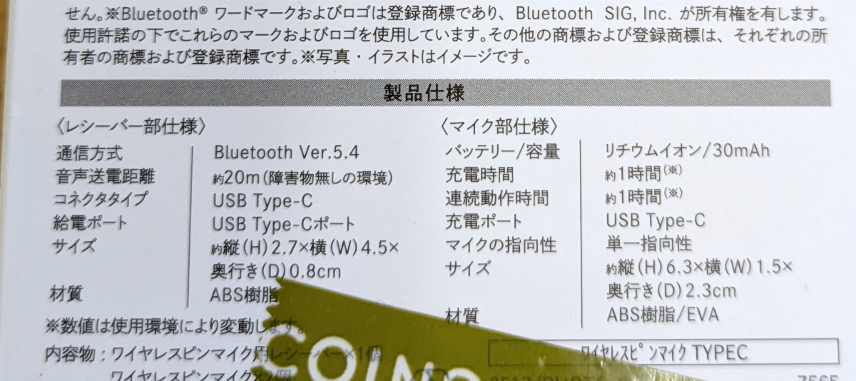 製品仕様を見ると、通信方式はBlueTooth Ver.5.4。音声の送電距離は障害物なしで約20メートルとのこと。マイクは1時間の充電で連続1時間動作する。