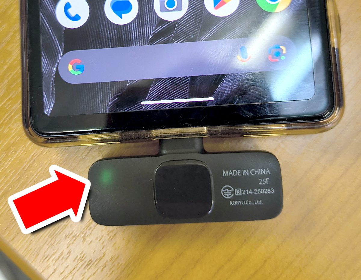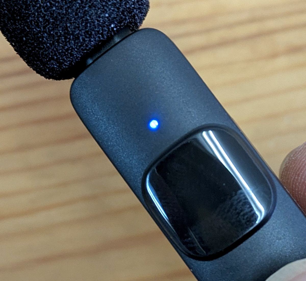 レシーバーをスマホに接続すると、本体の角に緑のランプが点滅。マイクと接続すると緑に点灯する。なお、スマホに接続する際は、あらかじめスマホのBlueTooth設定をオンにしておく必要がある。