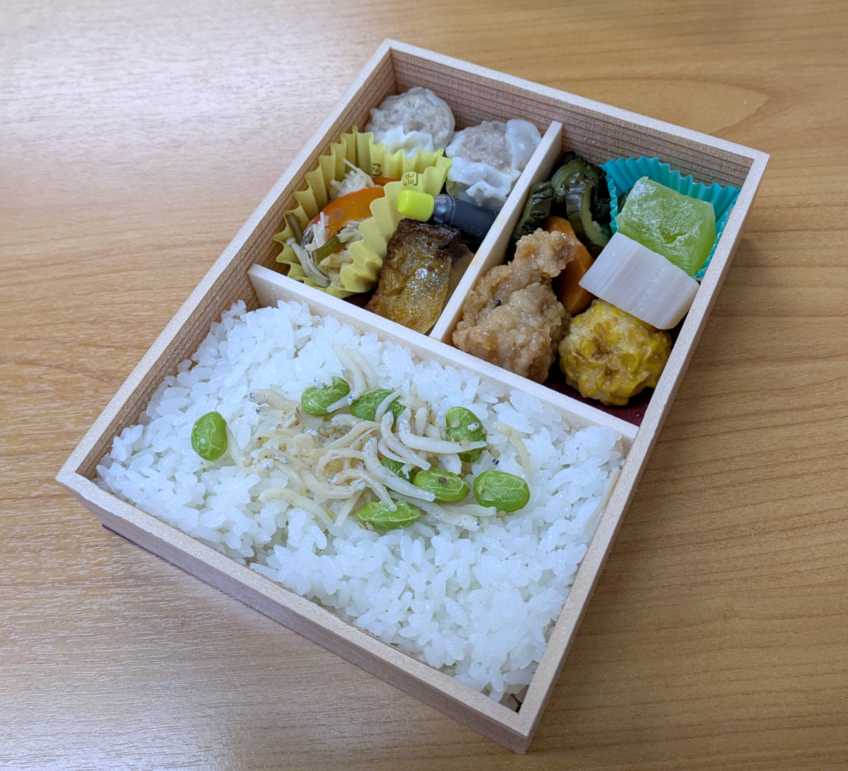 Yoshio「冷たくても美味い弁当って言ったら崎陽軒でしょ。崎陽軒の弁当はあたためを推奨してないんだよね。で、この弁当はご飯の上にしらすと枝豆が乗ってて、そういうの羽鳥さん、好きそうだなと思ってコレを選びました。かなり自信ある!」
