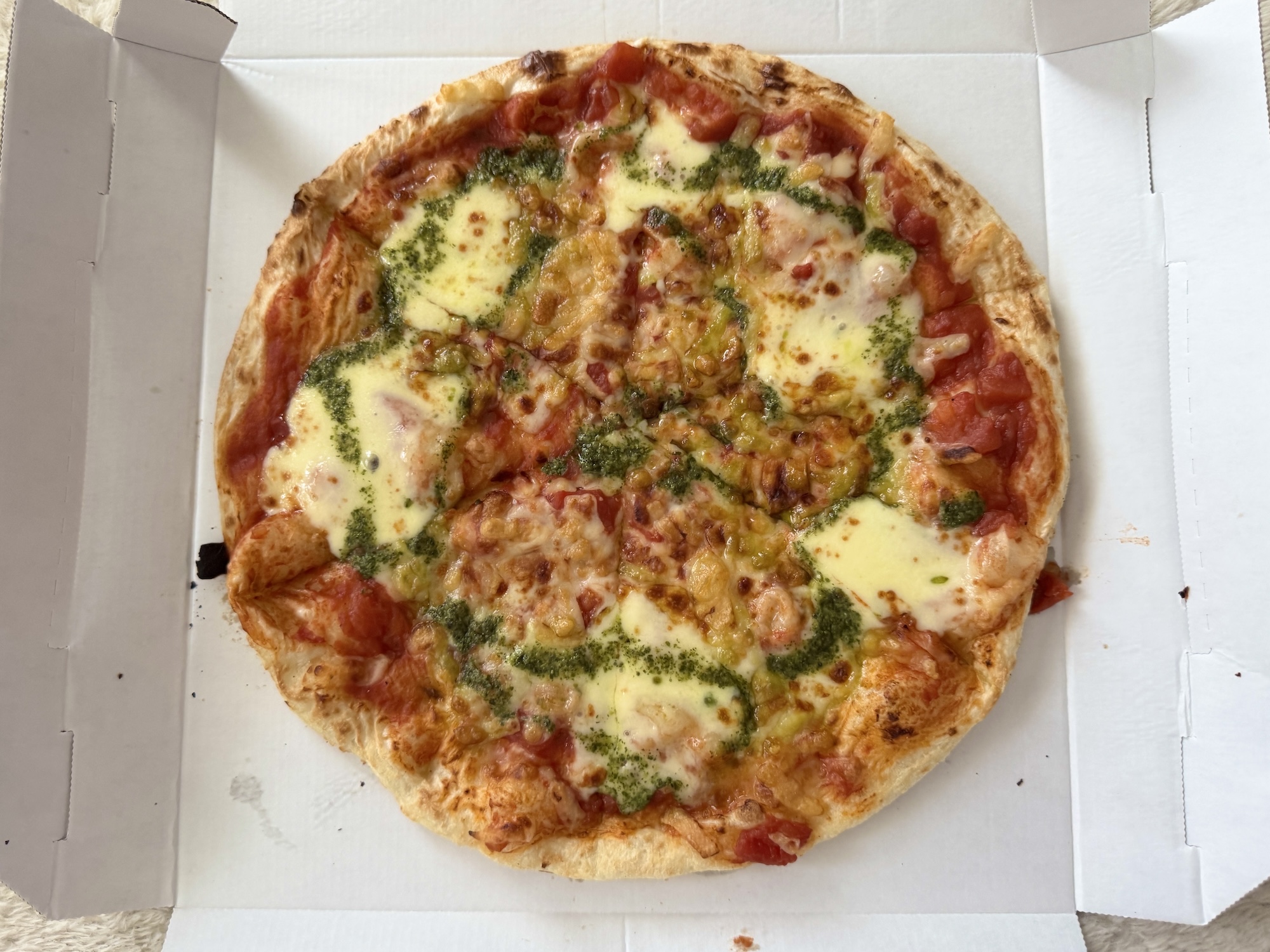うん、うまい! マルゲリータはマズくなりようがないピザとして知られるが、それにしてもなかなかハイレベルである。トマトの酸味がしっかりしてチーズがドサッ! として、「チェーン店のピザ」より「イタ飯屋のピザ」に近い感じ。