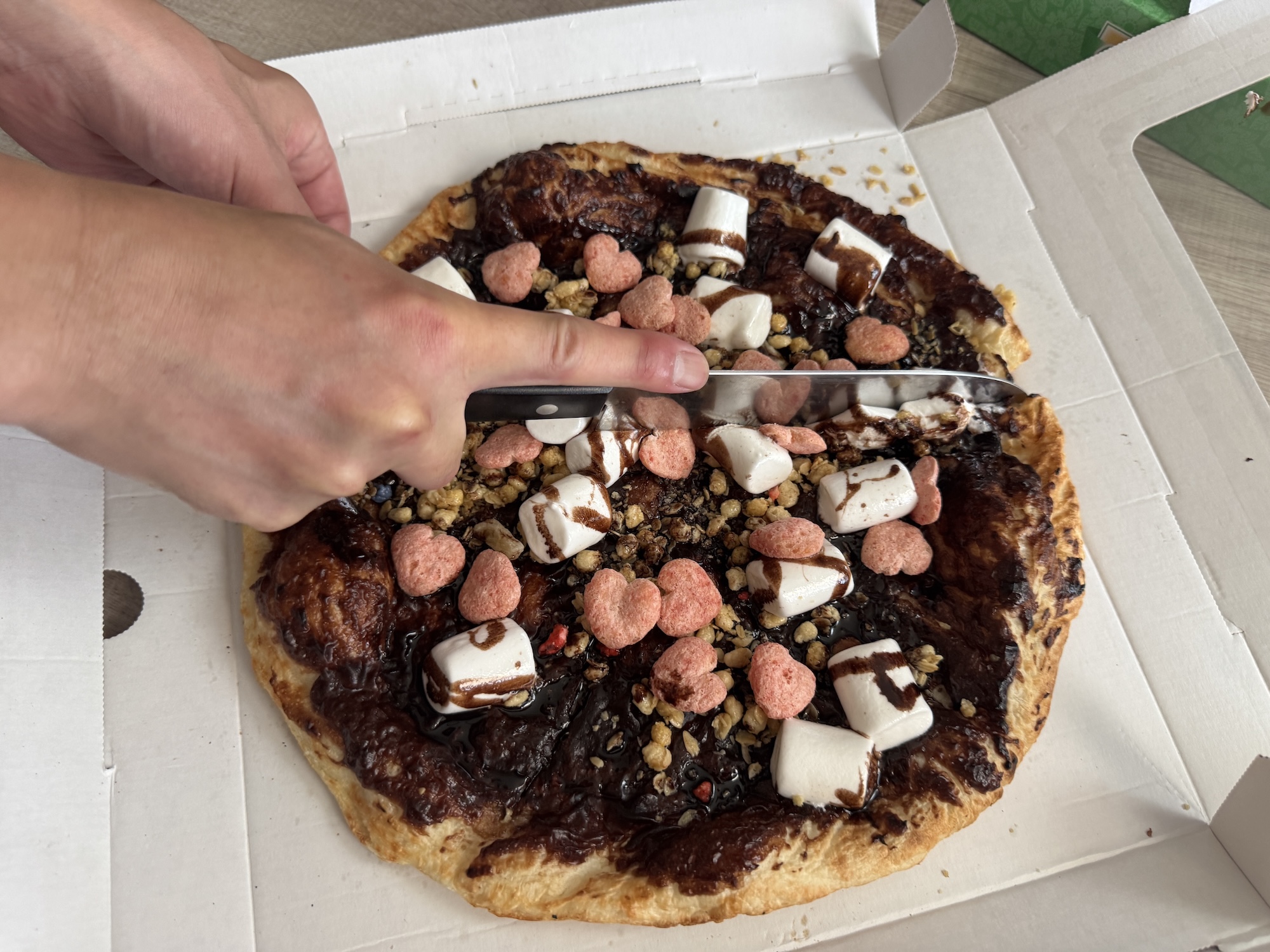 が、なぜかチョコマシュマロピザ(ハート)には切れ目が入っていない様子なのである。仕方ないので包丁でカットを試みると……