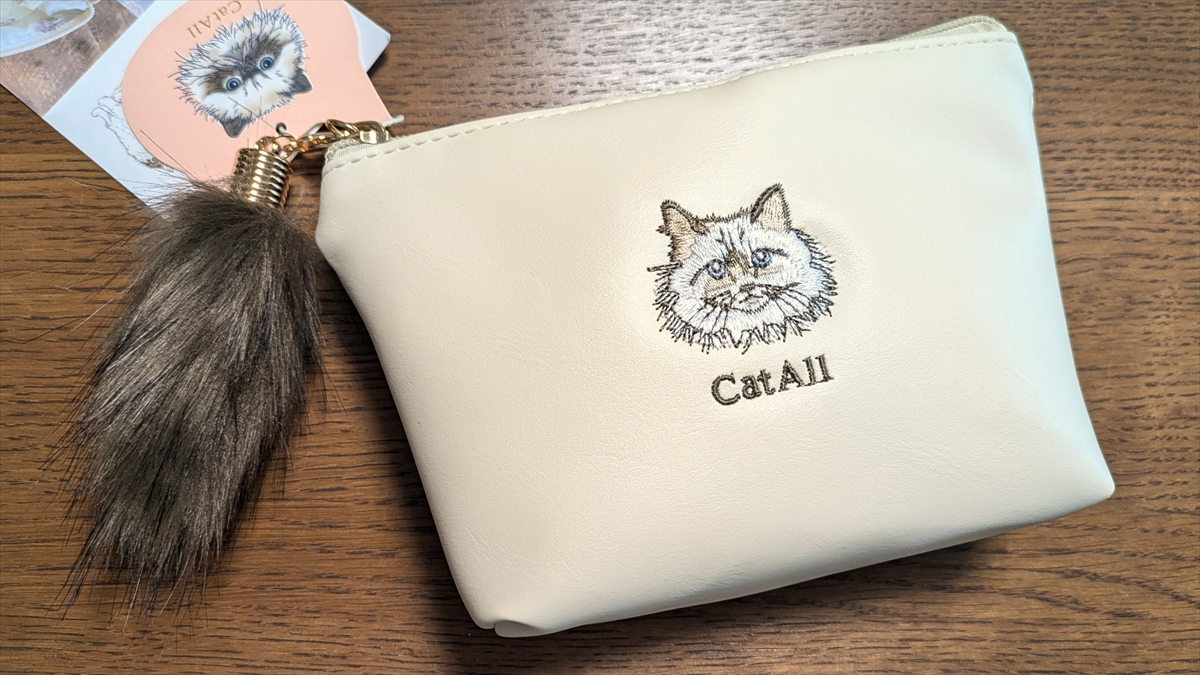 モフモフのしっぽ風チャームが付いた猫ちゃんのポーチである。刺繍のしっかりした作りで、つぶらな瞳がこちらを見つめてくる。