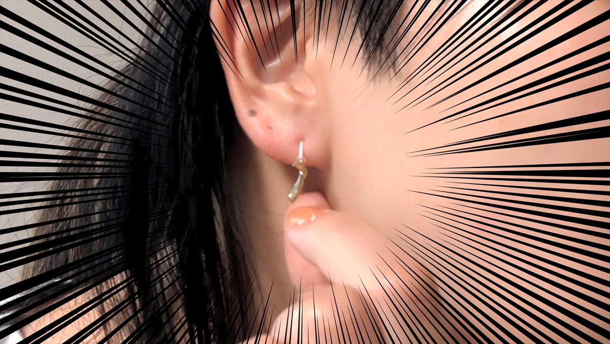思わず笑ってしまった。だって、筆者のピアスホールの位置が高過ぎたのか、ピアスの先端が耳たぶに突き刺さっているんだもの。