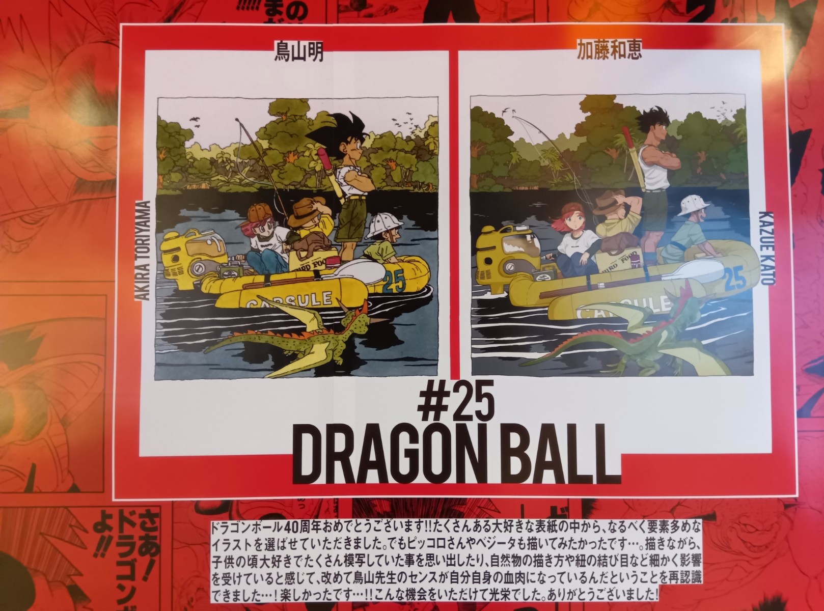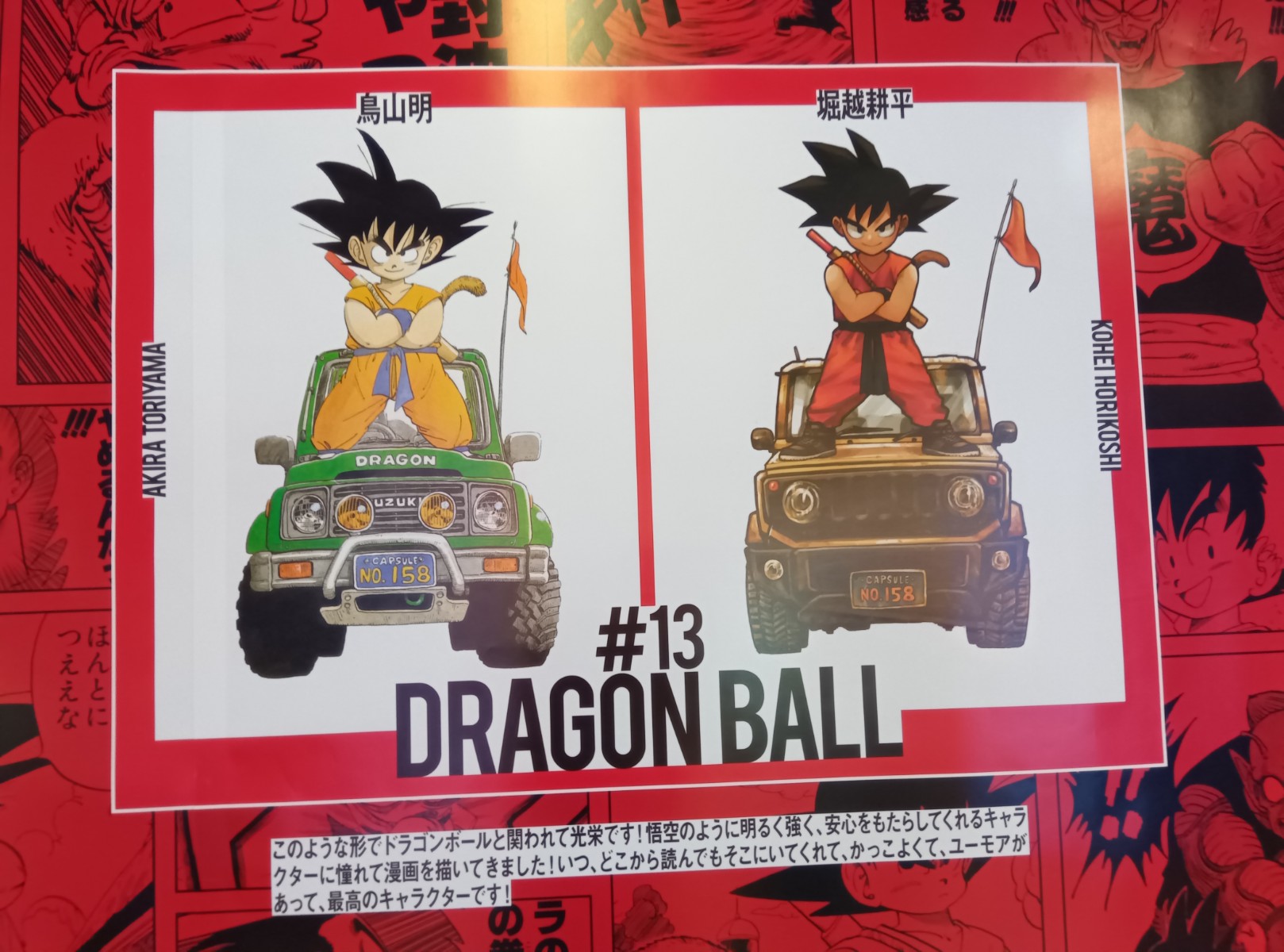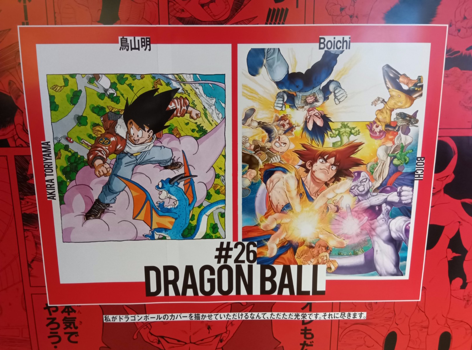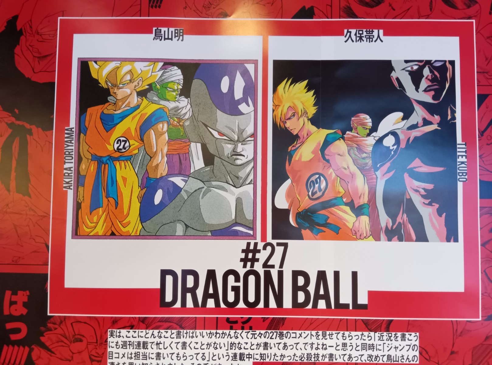 最近はさすがにジャンプを買ってなかったのに、ほぼ全員作品が分かった。なお、この42人の作家によるイラストは最強ジャンプの裏表紙にて連載されていたスペシャル企画「DRAGON BALL SUPER GALLERY」のものであり、今回のボックスセットのダブルカバーコミックスのカバーイラストの1枚になっている。