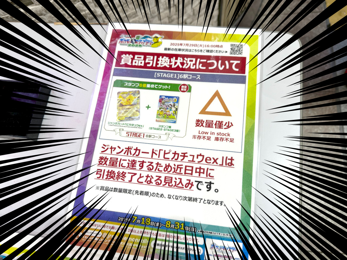 ジャンボカード「ピカチュウex」は数量に達するため、近日中に引き換え終了となる見込みです。#JR東日本ポケモンメガスタンプラリー#アニポケ pic.twitter.com/54acwjl0Ob— JR東日本 ポケモンメガスタンプラリー2025(公式) (@jrepokemonrally) July 29, 2025
