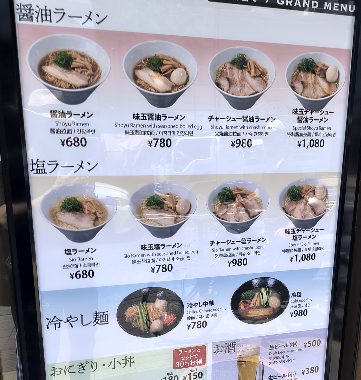 メニューは醤油・塩ラーメンをメインに、各種トッピングが揃っている。そのほか、冷やし中華と冷麺。あとはサイドメニューにおにぎり・小丼・餃子も用意している。