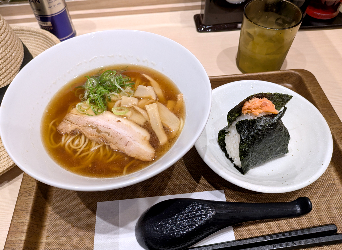 さて、私が頼んだのは「醤油ラーメン」(税込680円)とセット注文の「おにぎり」(鮭:税込150円)、それから「餃子」(3個:税込180円)である。