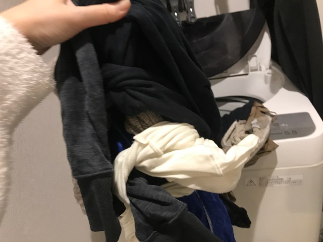 洗濯機は夫の家にあったものを使うことになったのだが、完全に独身者向けのモデルで最大容量が45リットル。二人分の洗濯物を洗うには小さすぎた。ちょっとでも多く洗濯物を入れると、上記の通り、現代アートのように絡まった物体が出てくる始末。