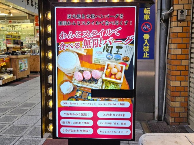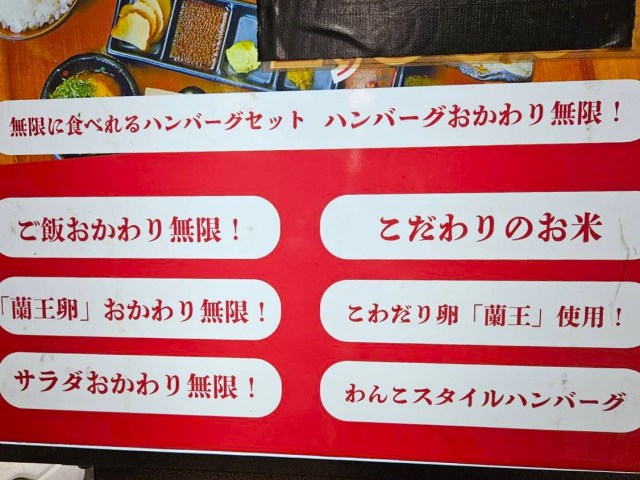 店頭の看板には「ハンバーグを、わんこスタイルで無限に楽しめる」といった旨の説明書きがされている。